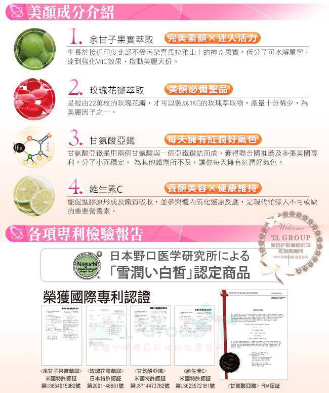 成分:余甘子果實萃取、玫瑰花瓣萃取、甘氨酸亞鐵、維生 素C。