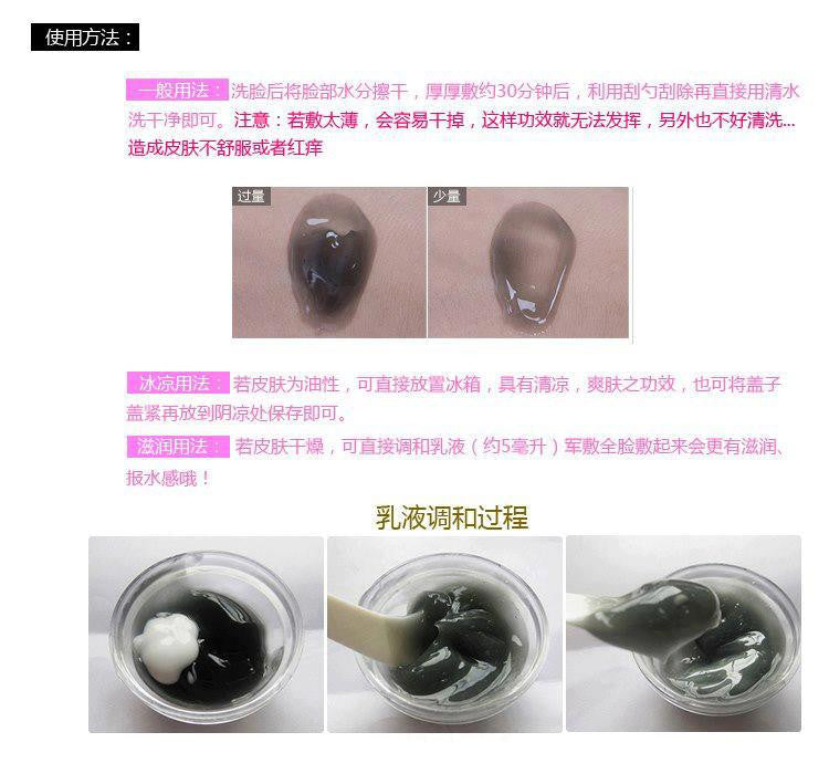 取适量产品直接敷于全脸(厚度约0.3cm),待30分 钟后,可利用挖棒先轻轻刮除再用清水洗净即可。若敷太薄 容易干掉,造成清洗不易或者皮肤发红哦。