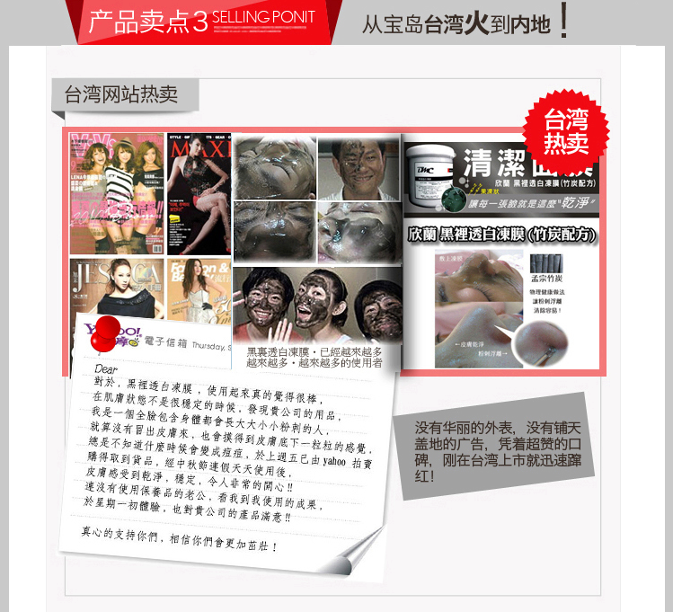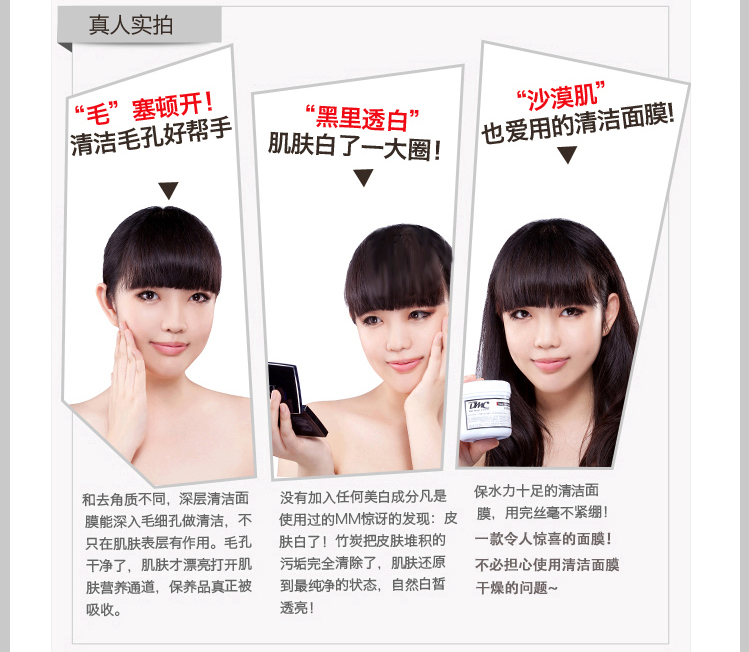 “黑里透白”肌肤白了一大圈:没有加入任何美白成分,凡 是使用过的MM却惊讶的发现:皮肤白了!竹炭把皮肤堆积 的污垢完全清除了,肌肤还原到最纯净的状态,自然白皙透 亮!