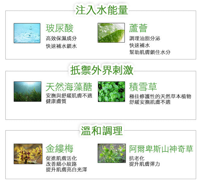 破天荒同時添加阿爾卑斯山上的「神奇草」萃取精華及天然海藻醣,以及曬後最愛的蘆薈萃取,加上玻尿酸、金縷梅、積雪草、歐前胡葉萃取等天然保養成分,能有效補充並鎖住肌膚水份,調理過多油脂分泌、代謝老廢角質、緊緻毛孔,改善因乾燥引起的缺水現象,提升肌膚光澤,舒緩曬後或乾沽暗沈肌膚,溫和呵護受損肌膚,達到活化、鎖水、保濕、緊緻、抗皺、舒緩、修護等多重極致功效,讓肌膚恢復清爽水潤的健康狀態,呈現完美無瑕亮白美肌!