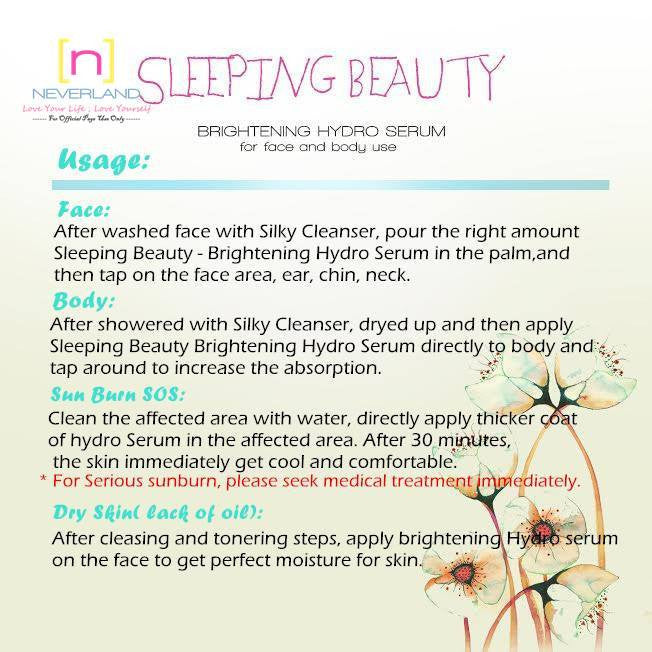 使用睡美人-丝绸洁肤液后,用 睡美人-美白精华露 抹干脸部,直接倒出适量的睡美人-美白精华露在手掌心, 然后在脸上轻按及轻拍每个部分,耳背,下巴,颈项。
