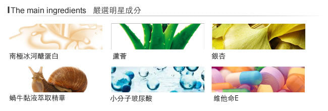 成分:南極冰河醣蛋白、有機蘆薈、有機銀杏、鍋牛粘液萃取精華、小分子玻尿酸、維他命E、分子丁